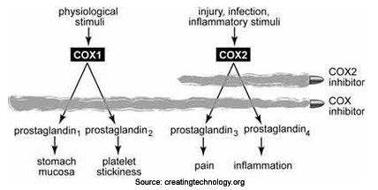 Cox-1 inhibitor: An agent that inhibits the action of the enzyme cox-1(cyclooxygenase-1). The common anti-inflammatory drugs such as aspirin,ibuprofen, and naproxen block the action of both cox-1 and cox-2. Cox-1 inhibitors can reduce inflammation, but they may also decrease the natural protective mucus lining of the stomach. Therefore, these medications can cause stomach upset, intestinal bleeding, and ulcers. In some cases, using a buffered form of a cox-1 inhibitor can eliminate or reduce these adverse effects.