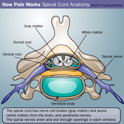 The signals from your cut hand travel into the spinal cord through the dorsal roots. There, they make synapses on neurons within the dorsal horn (the top half of the butterfly-shaped gray matter). They synapse on neurons within the spinal cord segment that they entered and also on neurons one to two segments above and below their segment of entry. These multiple connections relate to a broad area of the body — this explains why it’s sometimes difficult to determine the exact location of pain, especially internal pain.