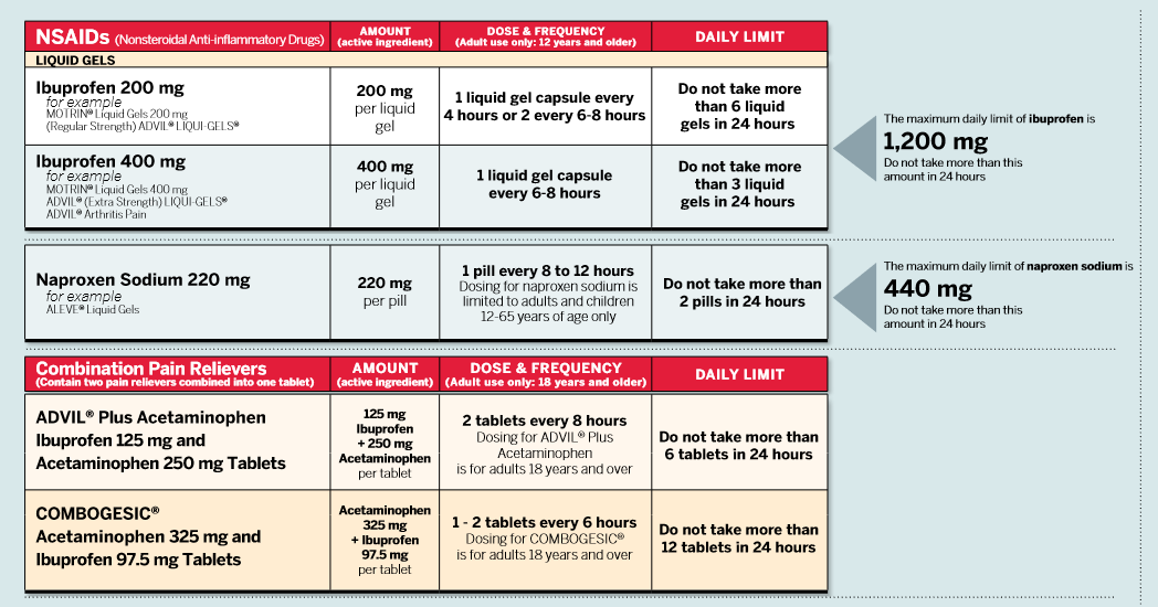 | Ibuprofen | 400 mg | 1200 mg |