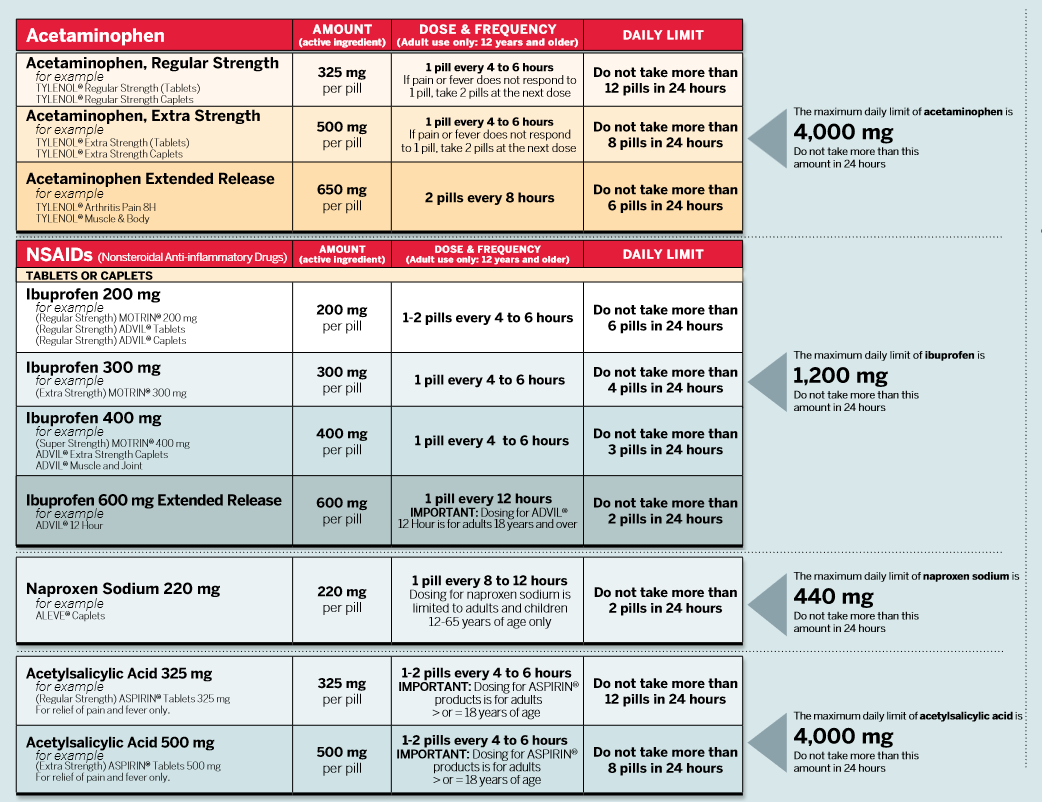 | ASA | 1,000 mg | 3,000 mg in people under 65, 2,000 mg in people over 65 |